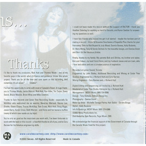 I have two friends who helped me get it all started - maybe the hardest part of making a record - Victor & Rosanne Deschenes of Expedite Plus; thanks for your friendship. Ditto to Rob Bryant & Judy Mead, Donnie Bowes, Kelly Bodanis, Dr. Mary Wong, Tony & Wanda Delitala for the beautiful design, and Denise Grant and Bern for the fabulous photos.