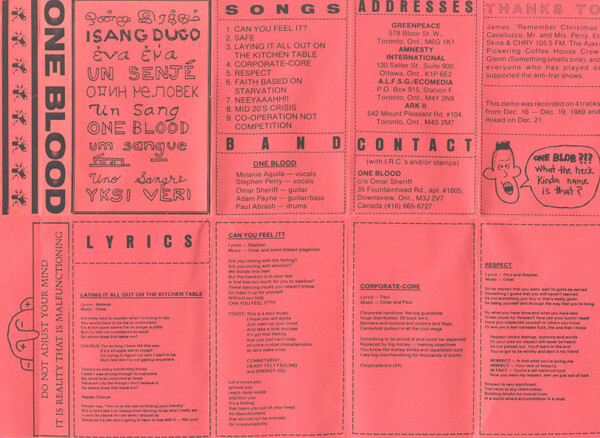 One Blood were a Toronto, Ontario hardcore punk band active at the turn of the 1990s, emerging from the city’s underground with a sound and message rooted in political confrontation and collective resistance. The group’s core lineup included Stephen “The Wizard of Willowdale” Perry on vocals, Adam Payne and Omar Sheriff on guitars, Jim Ware on bass, and Paul Abrash on drums, with early recordings also featuring vocal contributions from Melanie Aguila.