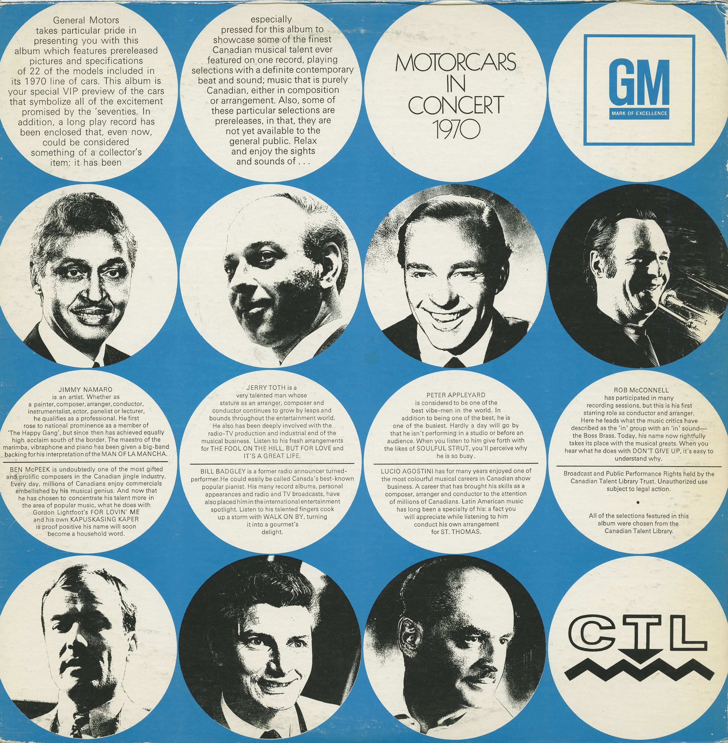 especially pressed for this album to showcase some of the finest Canadian musical talent ever featured on one record, playing selections with a definite contemporary beat and sound; music that is purely Canadian, either in composition or arrangement. Also, some of these particular selections are prereleases in that, they are not yet available to the general public. Relax and enjoy the sights and sounds of . . .MOTORCARS IN CONCERT 1970