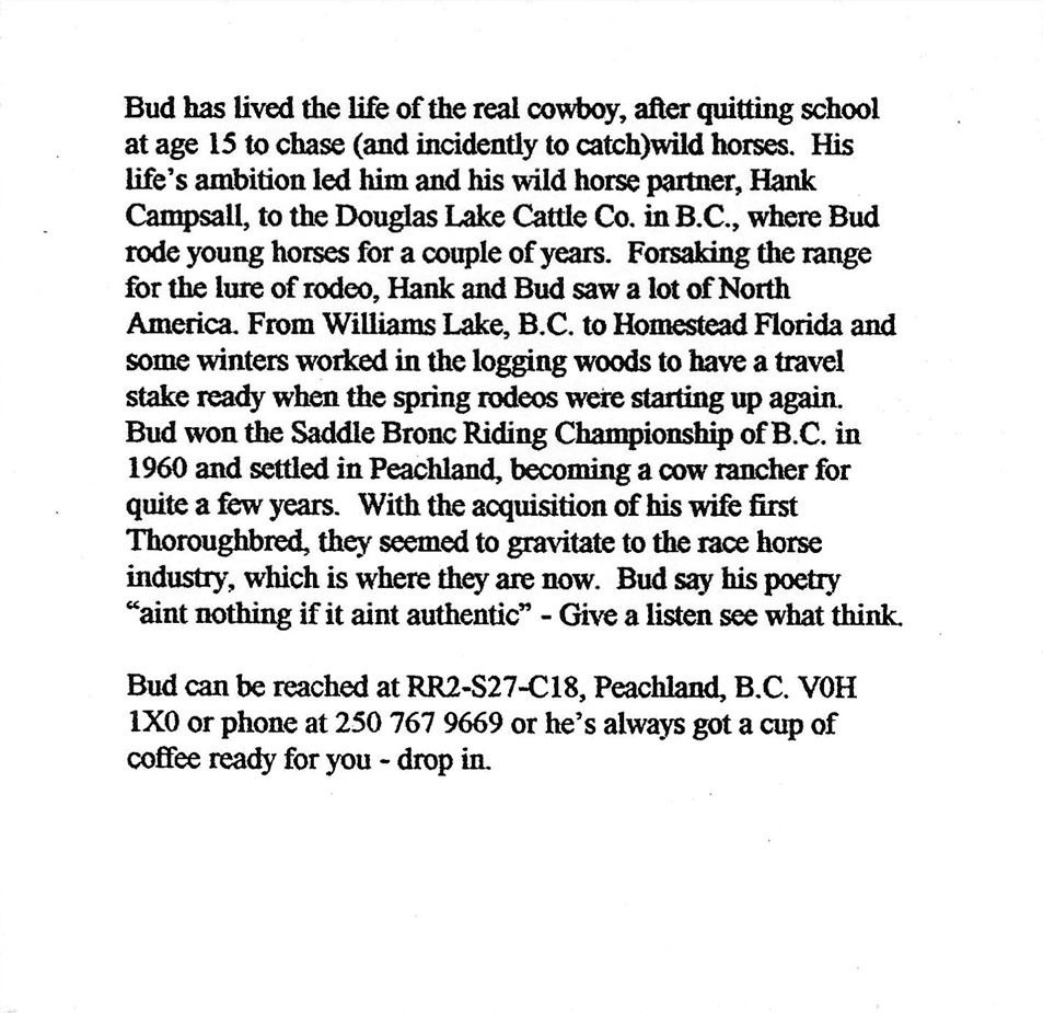 Parallel to his rodeo accomplishments was his emergence as one of Canada’s most respected cowboy poets. Bud was inducted into the BC Cowboy Hall of Fame in 2001 in the Artistic Category, recognition that placed him among the province’s most important cultural torchbearers of the ranching tradition. He was also the first Canadian invited to perform at the renowned Elko Cowboy Poetry Gathering, a testament to his standing within the international cowboy poetry community.
