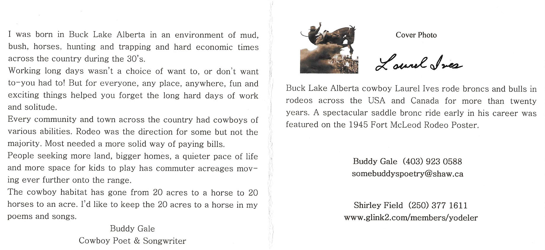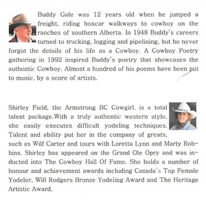 Buddy Gale was 12 years old when he jumped a freight, riding boxcar walkways to cowboy on the ranches of southern Alberta. In 1948 Buddy’s careers turned to trucking, logging and pipelining, but he never forgot the details of his life as a Cowboy. A Cowboy Poetry gathering in 1992 inspired Buddy’s poetry that showcases the authentic Cowboy. Almost a hundred of his poems have been put to music, by a score of artists.