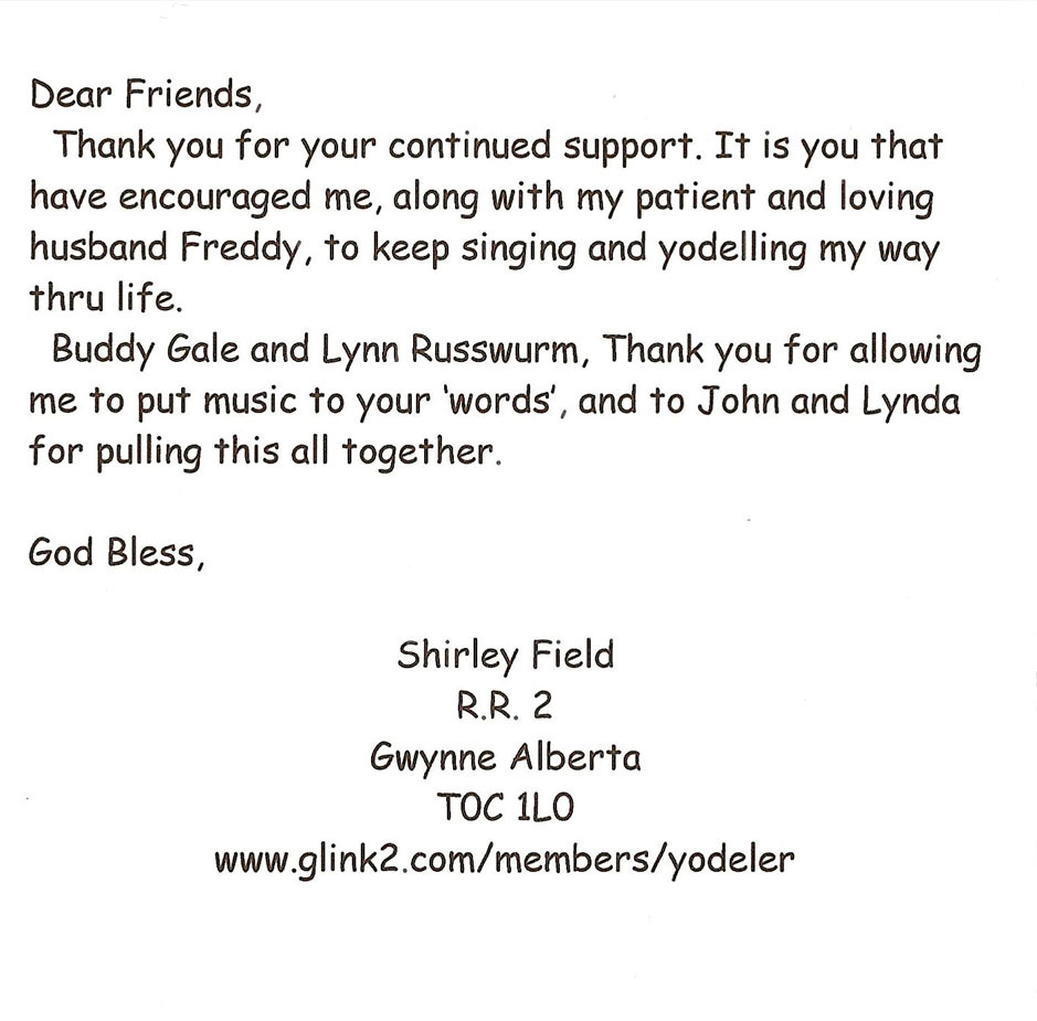 Thank you for your continued support. It is you that have encouraged me, along with my patient and loving husband Freddy, to keep singing and yodelling my way thru life.
