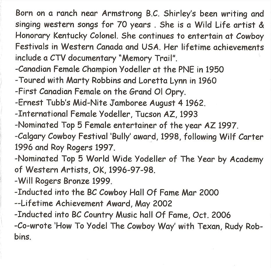 Born on a ranch near Armstrong, British Columbia. Shirley’s been writing and singing western songs for 70 years. She is a Wild Life artist & Honorary Kentucky Colonel. She continues to entertain at Cowboy Festivals in Western Canada and USA. Her lifetime achievements include a CTV documentary “Memory Trail”.