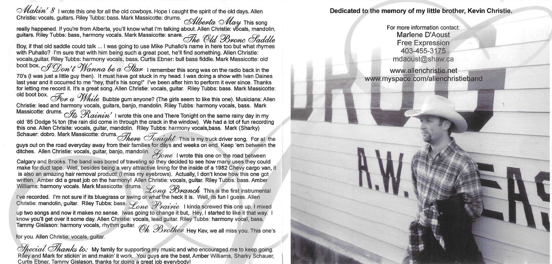 Allen Christie is an Alberta cowboy balladeer, songwriter, and multi-instrumentalist whose music is deeply rooted in ranch life, rodeo culture, and the Western heritage of central Alberta. Raised in the Caroline–Innisfail–Rocky Mountain House region, Christie grew up immersed in a family where horses, cattle, and rodeo were not romantic ideas but daily realities.