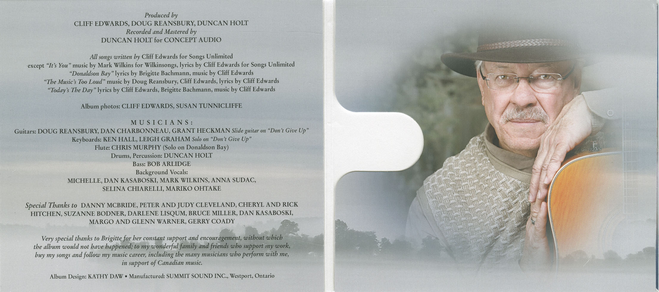 Very special thanks to Brigitte for her constant support and encouragement, without which the album would not have happened; to my wonderful family and friends who support my work, buy my songs and follow my music career, including the many musicians who perform with me, in support of Canadian music.