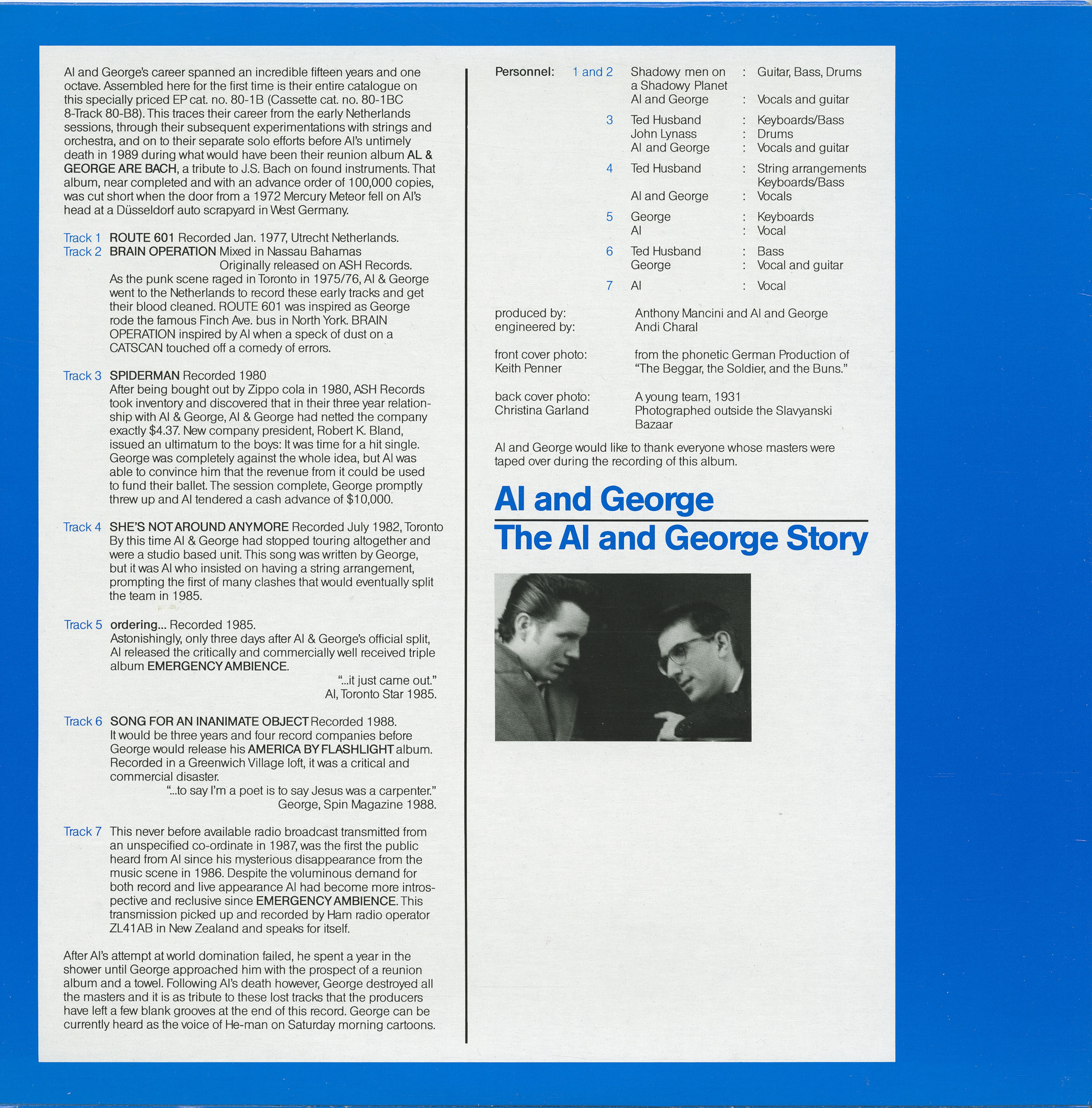 AI and George’s career spanned an incredible fifteen years and one octave. Assembled here for the first time is their entire catalogue on this specially priced EP cat. no. 80-1B (Cassette cat. no. 80-1BC 8-Track 80-B8). This traces their career from the early Netherlands sessions, through their subsequent experiments with strings and orchestra, and on to their separate solo efforts before Al’s untimely death in 1989 during what would have been their reunion album AL & GEORGE ARE BACK!, a tribute to J.S. Bach on found instruments. That album, never completed and with an advance order of 100,000 copies, was cut short when the door from a 1972 Mercury Meteor fell on Al’s head at a Düsseldorf auto scrapyard in West Germany.