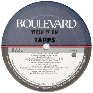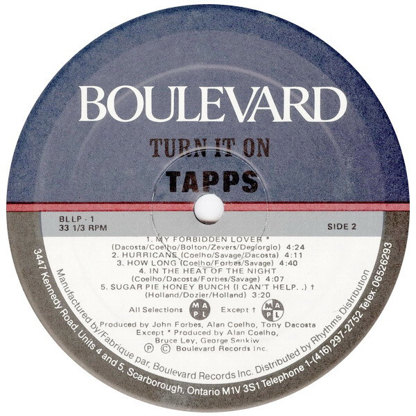 That strategy culminated in Turn It On, the groupâs only full-length LP, released by Boulevard in 1987. The album gathered new material and reworked signature songs into the most complete statement of the Tapps sound. Tracks such as âDonât Pretend To Know,â âGoodbyes,â âRunaway (With My Love),â âBreak It Up,â âMy Forbidden Lover (â86 Version),â âHurricane,â âHow Long,â âIn The Heat Of The Night,â and âSugar Pie Honey Bunch (I Canât Help...)â presented a polished blend of Hi-NRG, synth-pop and disco-inflected dance music. Candy Berthiaume remained the principal lead vocalist, while Allan Coelho and Tony DaCosta supplied backing vocals and keyboards. Production was shared among Coelho, John Forbes and Tony DaCosta on most of the LP, with Bruce Ley and George Semkiw co-producing âMy Forbidden Lover (â86 Version).â The albumâs dense network of Toronto studio collaboratorsâAmber Studios, Forbes Studios, Metalworks, George Semkiw, Hugh Cooper, Carolynne Saxton and Bruce Leyâplaces Tapps squarely within the professional dance-pop infrastructure that was operating in Toronto during the period.