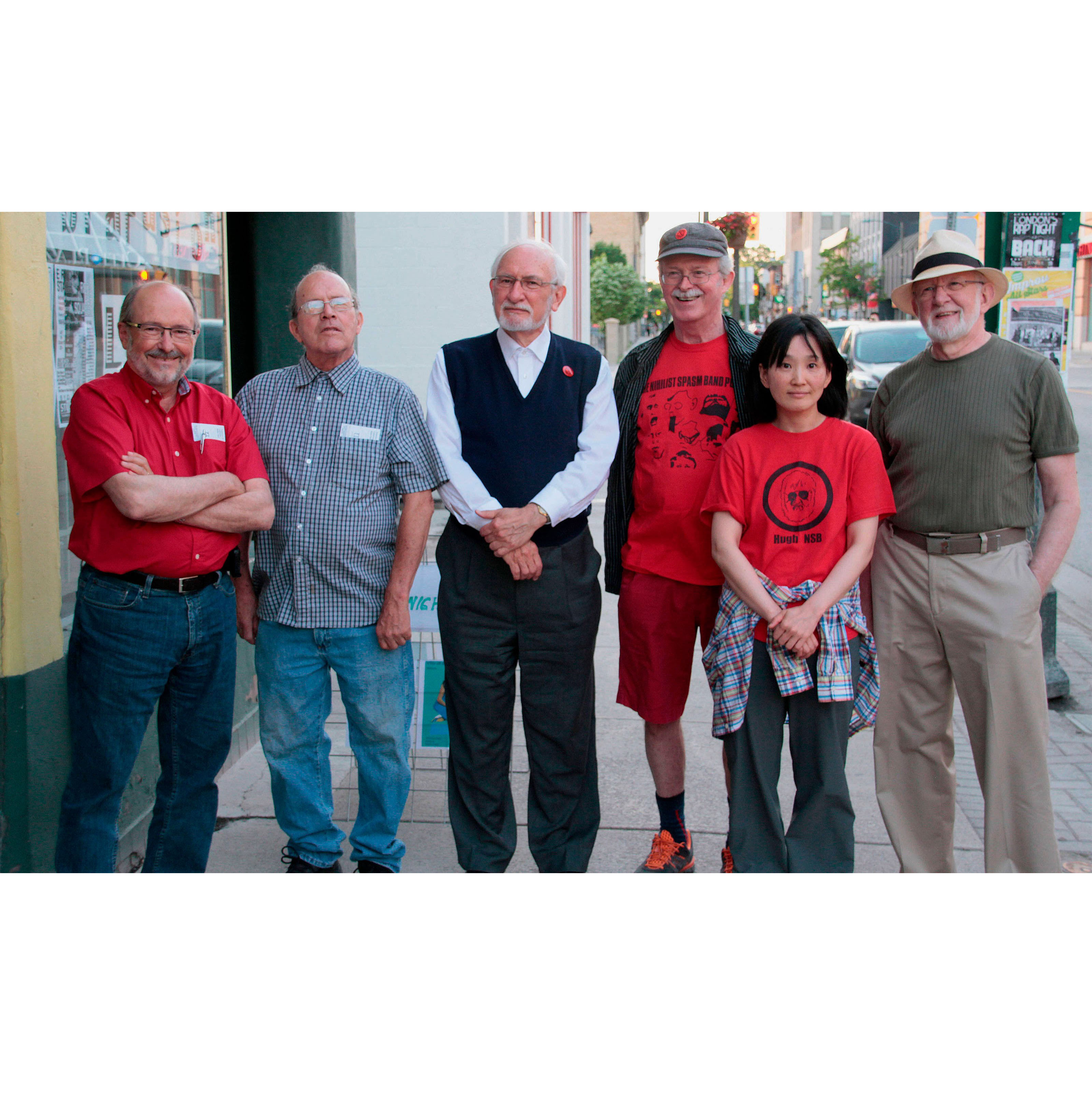 The NSB was formed in 1965 by a group of people who enjoyed music and wanted to play in a band. There was no desire to learn to play traditional instruments so kazoos were bought and assorted noise makers modified or built from scratch. The band started playing regularly every Monday night in 1966 and has just carried on .The personal has stayed the same. John Boyle (artist) kazoo and drums, John Clement (MD) guitar and drums, Bill Exley (geezer/latinist) vocals, Murray Favro (artist) guitar and Art Pratten (pensioner/gentleman of leisure) Pratt-a-various and Waterpipe. Greg Curnoe (deceased), Hugh McIntyre (deceased) and Archie Leitch (permanently retired) play less often.