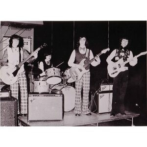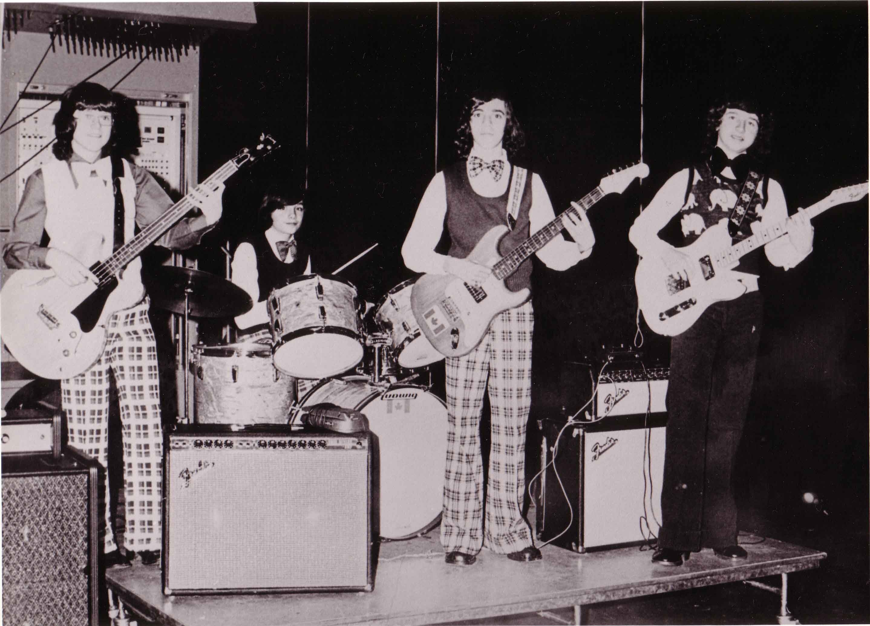 They were interested in music and were all enrolled in music lessons. Alex was learning the violin and guitar. John was quite a bagpipe artist and was also learning guitar. Kevin was already showing his 6 string prowess and was the first to get an electric guitar and amp. Jeff had been playing in the Police Boys Band for a few years but his parents had not yet caved into the pressure to buy a drum set. All five of the boys went to the same school and were introduced to the fun of a rock band by their music teacher Ken Danylchuk. After hearing Kevin sing his rousing version of Hey Jude in music class John, Jeff and Rocky invited Kevin to join the new band that they were starting. Kevin insisted that his best friend Alex could sing and should be invited too. The first practice was a tension filled affair with friends and family watching as the boys worked their way through songs by the Bee Gees , Beatles and the Animals. More practices followed and the guys became best friends quickly. Jeff got his much yearned for drum set and all the guys got electric guitars. Rocky eventually dropped out of the group but remained a good friend to all the members of the band.