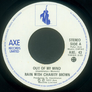 Members of RAIN are drummer Chris Woroch, guitarist Bill McLaughlin, lead vocalist Phyllis Brown, bassist Ron Hiller and keyboards Charlie Hall. Producer Greg Hambleton brought his song "Out Of My Mind" to Rain and recorded and engineered the session at Sound Canada Studios in early 1971. After its release by London Records in April, it took seven months before finally charting in November and now established as one of the biggest hits of that year. This was followed by "Stop Me From Believing" (AXE 1) - both singles released by Bell Records in the United States.