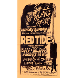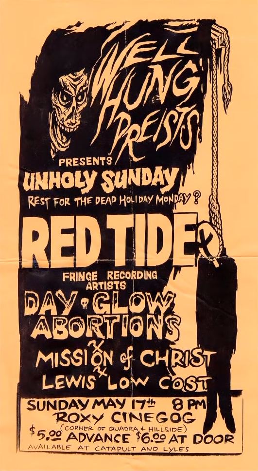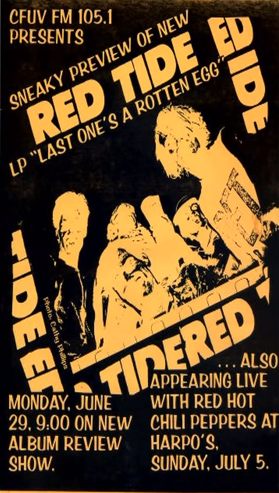 Red Tide were from Sooke, British Columbia and evolved out of a number of bands from that scene which include Youth Plague, Suburban Menace, and Censored Chaos. The band was described as the Hummer of Punk Rock in that it was utilitarian, stripped down, hard and fast inspired by the jack-hammer of life which pounded away in our heads as they drank lots of beer and took acid/mushrooms on as many weekends as we could find them. The band became known for the song "Incubator Slide" that appeared on the "Welcome to 1984" comp that MRR compiled. Toxic Shock Records from the States released this ep as it's fourth release in 1984. Red Tide featured Ken Jensen who would go on to play in DOA and die in a house fire. Prior to this they had recorded a couple of tapes and an unreleased LP. They got to play with the Red Hot Chilli Peppers, Pearl Jam, Really Red, Dead Kennedys, the Dayglos, and NoMeansNo.