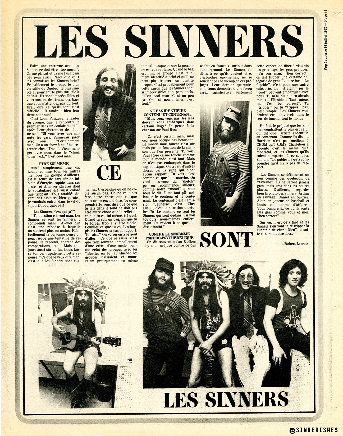 A 1972 Pop Jeunesse feature described the Sinners as “the simplest yet hardest band to define,” a group that thrived in contradiction—underground but universal, humorous yet deadly serious. Parizeau summed it up best: “We’re Québec tavern guys. We’ll never be huge, but we’ll be huge in small places.”
