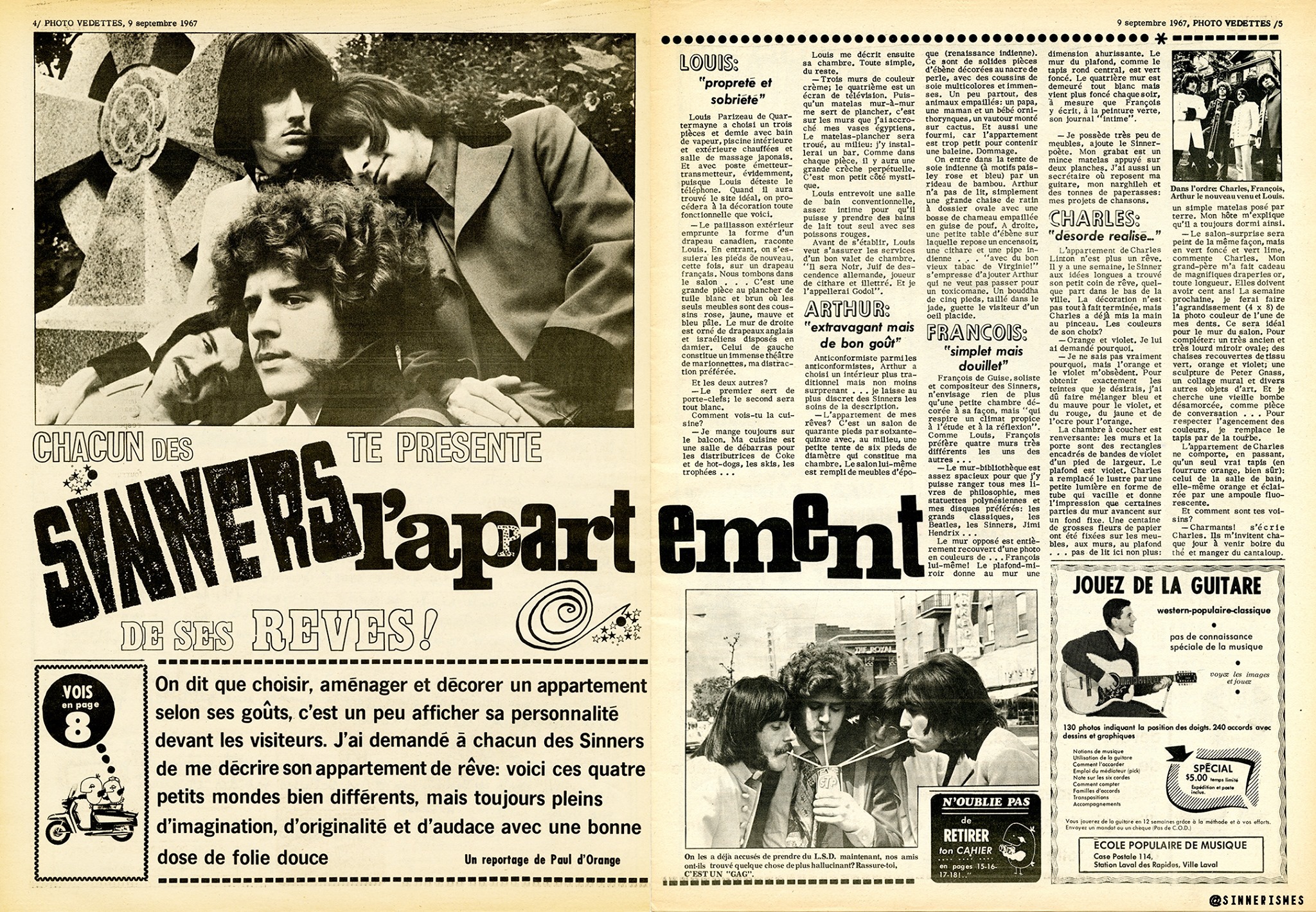 By late 1967, the group’s rising fame brought them to the pages of Photo Vedettes, where each member described his “dream apartment”—a playful snapshot of their personalities at the peak of the psychedelic era. Louis Parizeau imagined a minimalist room with “cleanliness and sobriety,” complete with a Japanese massage table and a bar built into the bed. François Guy envisioned a simple, sunny studio with a diary painted directly onto the walls. Jean-Guy “Arthur” Cossette dreamed of a tent of Indian silk and incense guarded by a jade Buddha, while Charles Linton, the band’s resident provocateur, fantasized about orange and violet walls, a four-foot photo of his own tooth, and a deactivated bomb for conversation. What might have been lighthearted fluff revealed their creative contradictions—each Sinner a collage of discipline, absurdity, and philosophy.