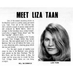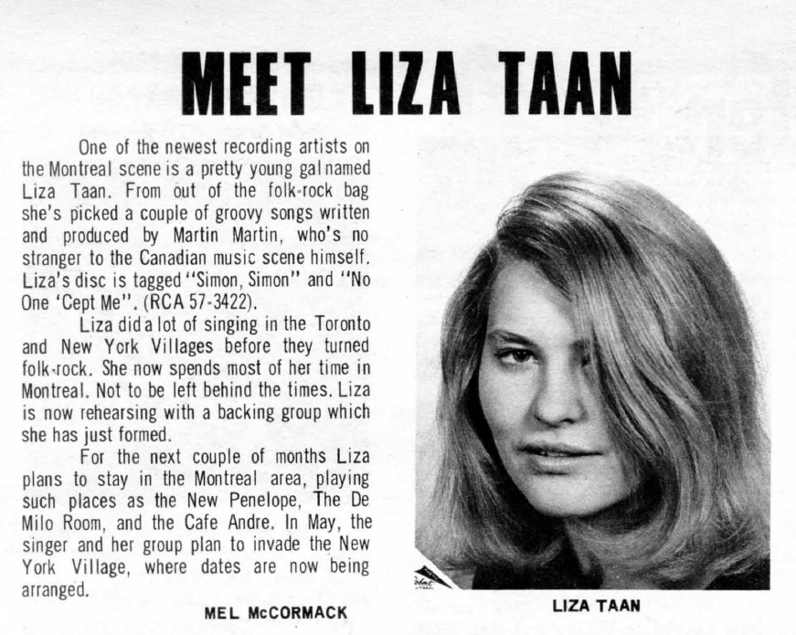 One of the newest recording artists on the Montreal scene is a pretty young gal named Liza Taan. From out of the folk-rock bag she's picked a couple of groovy songs written and produced by Martin Martin, who's no stranger to the Canadian music scene himself. Liza's disc is tagged "Simon, Simon" and "No One 'Cept Me" (RCA 57 -3422). Liza did a lot of singing in the Toronto and New York Villages before they turned folk, rock. She now spends most of her time in Montreal. Not to be left behind the times. Liza is now rehearsing with a backing group which she has just formed.