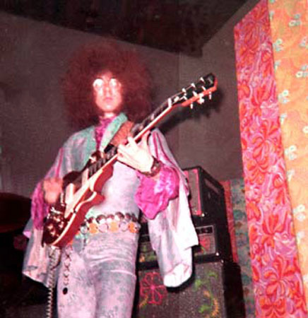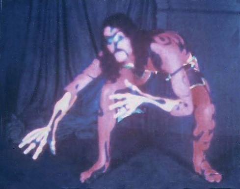 Our change to the show was such a hit we kept it in and built on it over the next year. First we changed to fluorescent paint and started painting our hands as well. Then we painted all our stage equipment then added black lights and a strobe light (very popular in dance halls). Eventually we incorporated a Liquid Light show as well, which had been becoming the "in thing" with West Coast groups. The first night we added the black lights we were even amazed at the results. But we couldn't stop there! We decided to make ours a visual show as well as musical one and built the whole last set around the paint and black lights. We planned the last set to be a build up from an easy opening to an energetic and thunderous ending. Two of the members (Nick and Jim) started wearing swimsuits and we painted their whole bodies. We put the Zappa tune at the end and we would all wear robes in the last set with the body paint hidden underneath.