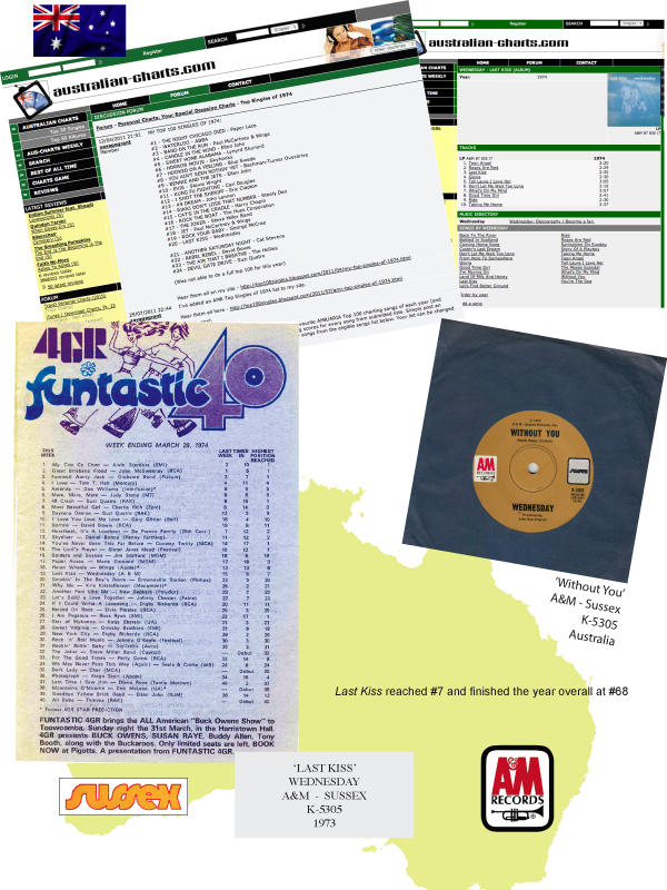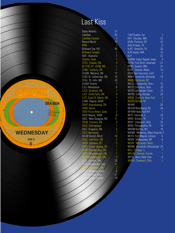 Wednesday continued to work the Ontario circuit honing their live show and building a loyal following. In late 1972 they recorded the Wayne Cochran song ‘Last Kiss’ at Toronto’s Manta Sound Studios, engineered by Lee DeCarlo (Lennon’s ‘Double Fantasy’, Aerosmith). The single was soon picked up by local radio stations. CFTR-AM played it immediately and indefinitely. Influential 1050 CHUM-AM jumped on the track and the song went to No.2, giving way to an avalanche of Canadian radio support. The song reached the number one position on Billboard’s Canadian chart and stayed there for six weeks earning them an ‘RPM Maple Leaf Award’ (the precurser of the JUNO), a Gold Record in 1973, and were nominated for several Junos.