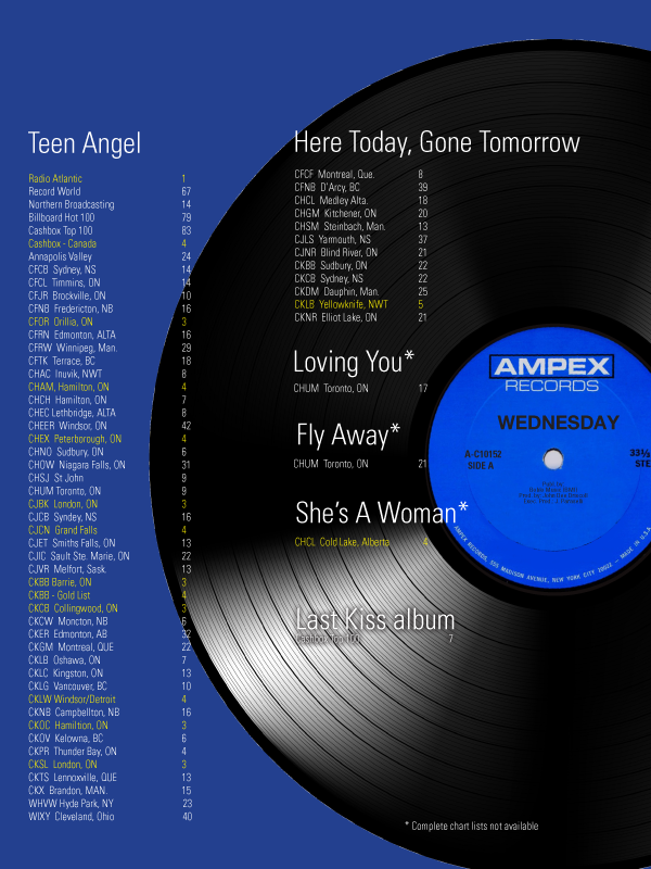 The buzz spilled over into the US market and reached #34 on Billboard’s ‘Hot 100’, selling well over a quarter million copies and topping the charts at many American city radio stations. A debut album was cut in 1974 at Manta Sound, Toronto and furnished Wednesday with a second hit, ‘Teen Angel’ (1974) reaching No.15 on Canadian charts.