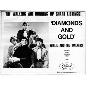 Capitol took out a half-page advertisement in RPM in April with a group portrait and the heading “The Walkers Are Running Up Chart Listings!” “Diamonds and Gold” entered the R.P.M. Canadian chart at #14 (and the general chart at #99) during the week of May 6, reaching its highest point at #3 during the weeks of 17 and 24 June. It was a strong debut, and Bill Hardie recalls that it got fairly heavy radio play in Vancouver and the lower mainland, as well as in Saskatchewan. It is a mystery as to why Petruk’s “Just Don’t Pretend” did not make it on the b-side, although he was no longer around to advocate for it. It is a strong composition with a driving performance, and fits perfectly into the band’s early oeuvre.