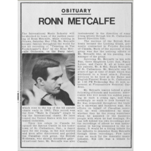 Ronn Metcalfe is a Canadian jazz musician born July 20, 1930 and died May 18, 1969. He evolved in the Niagara region. Although a tenor saxophonist by training, he was his leadership of his "big band", the Ronn Metcalfe Orchestra, that left his mark in the history of Jazz. His presence inspired musicians with the “fire” and “excitement” of the game. Their performances on stage exuded this energy.