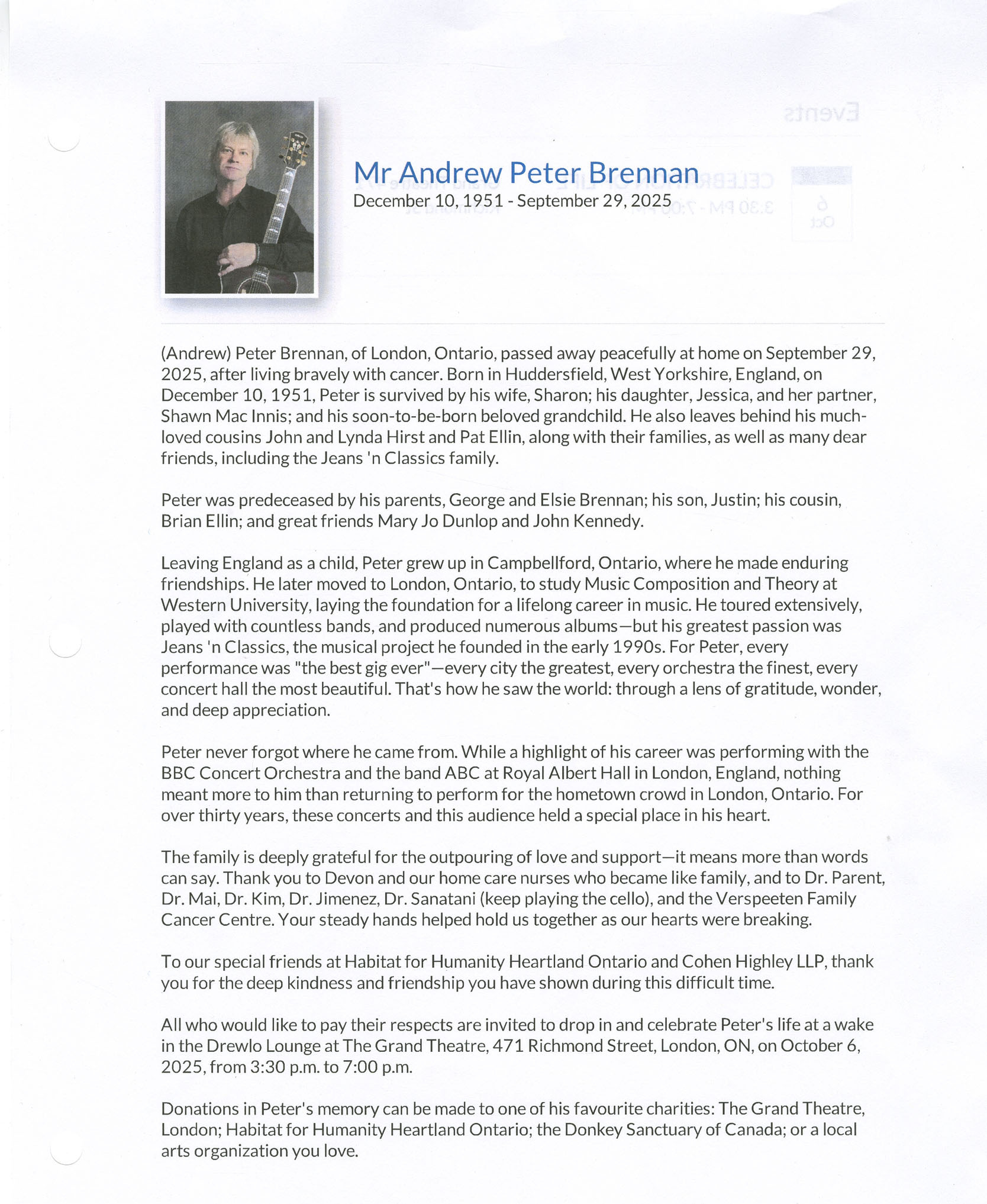 Peter Brennan passed away on September 29, 2025, after a courageous battle with cancer. In the wake of his passing, tributes poured in from musicians, orchestras, and collaborators across North America, reflecting not only the breadth of his musical impact but the depth of his kindness. His legacy endures in the countless performances he shaped, the artists he encouraged, and the enduring model he created for bridging popular music and orchestral tradition with integrity and joy.