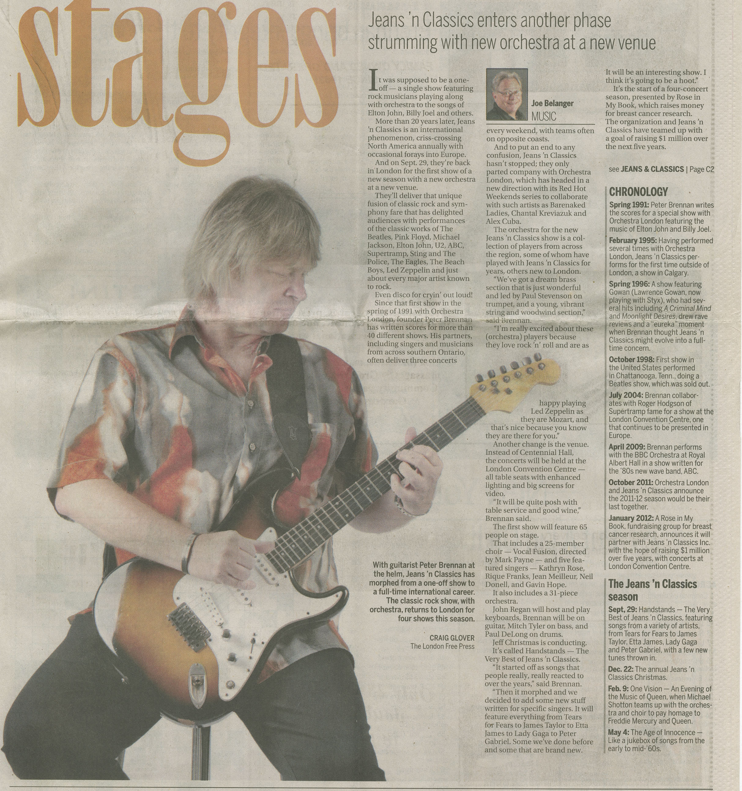 In 1990, Brennan was invited to collaborate with Orchestra London on a one-off concert combining orchestral performance with the music of Elton John and Billy Joel. Though he openly acknowledged having no prior experience scoring for a full orchestra, the project proved unexpectedly successful. What began as an experiment quickly evolved into a new musical concept, eventually formalized as Jeans ’n Classics—a collective of rock musicians performing alongside symphony orchestras, with Brennan serving as arranger, guitarist, and musical director.