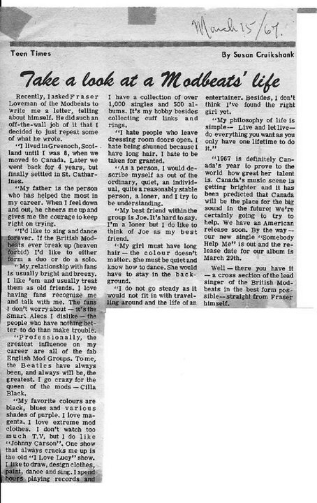 When you think of Mod music from the sixties that came out of Canada, The Modbeats are THE reference. They came out of the unlikely small city of St. Catharines, Ontario in the Niagara region. That didn't stop them from making a lasting impact on the thriving North American garage and psychedelic scene of that era.
