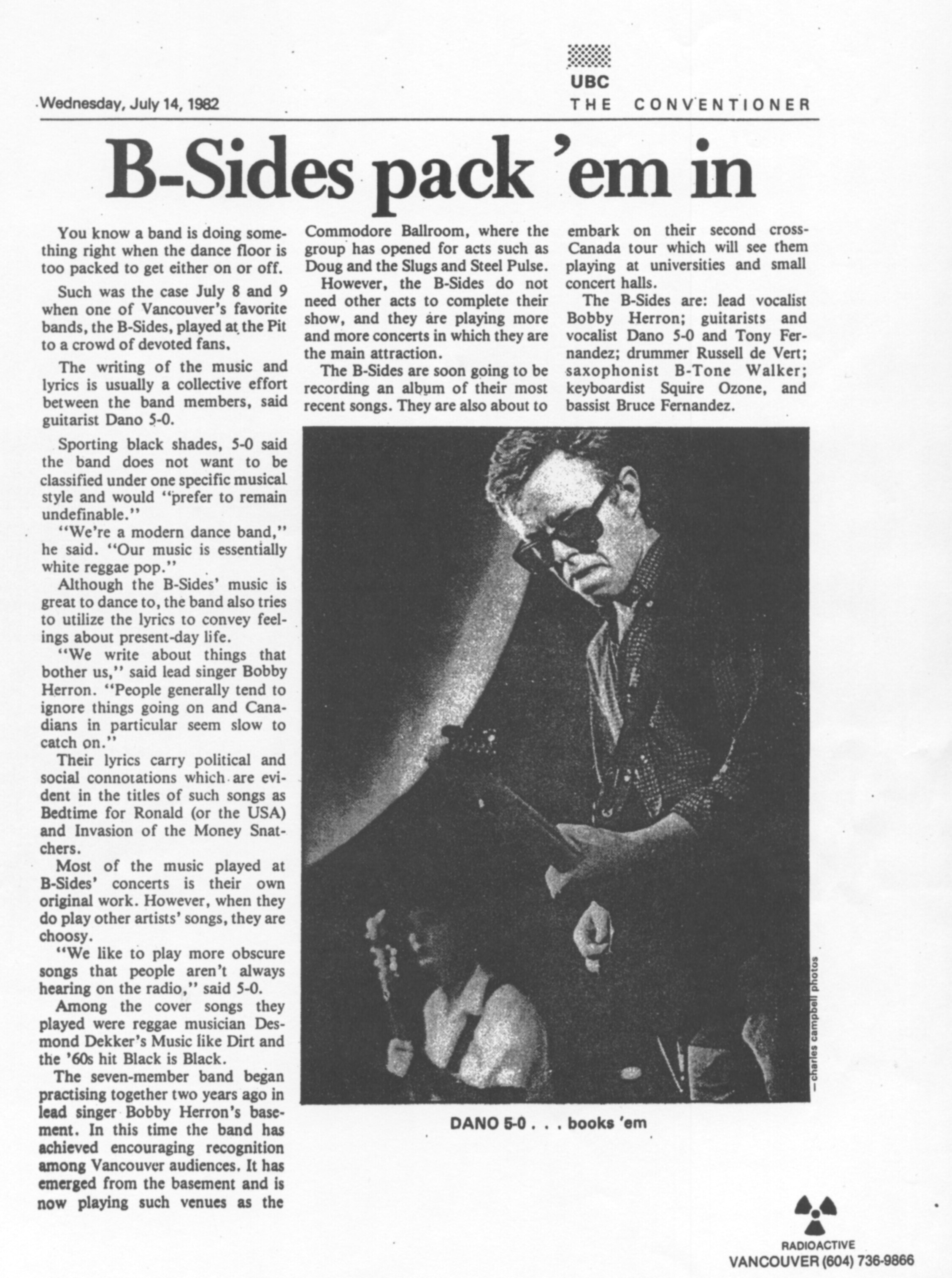The B-Sides’ lineup featured Bobby Herron (vocals, percussion), Dano 5-0 (guitar, vocals), Tony Fernandes (guitar, vocals), Bob “B-Tone” Walker (sax, flute, keys), Ryszard Ozimek (organ, trombone), Bruce Fernandes (bass), and Russell DeVert (drums). Keyboardist Squire Ozone and a rotating cast of backing singers also contributed. Their songs were often collaboratively written and unapologetically topical—titles like “Bedtime for Ronald (or the USA)” and “Invasion of the Money Snatchers” carried biting social commentary alongside irresistible grooves.