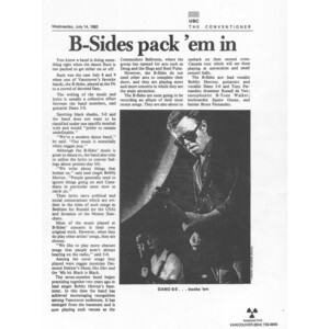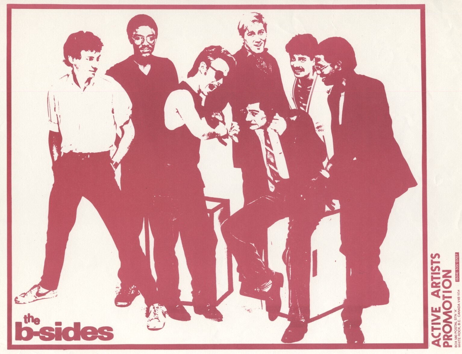 Describing themselves as “a modern dance band” with “essentially white reggae pop” roots, the B-Sides defied easy categorization. Their live shows were legendary, drawing sold-out crowds to venues like the Savoy, Town Pump, and Commodore Ballroom. In 1983, they were voted Best Club Band by the Georgia Straight, and their shows often broke bar sales records, including one week at Harpo’s in Victoria.