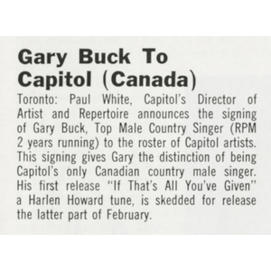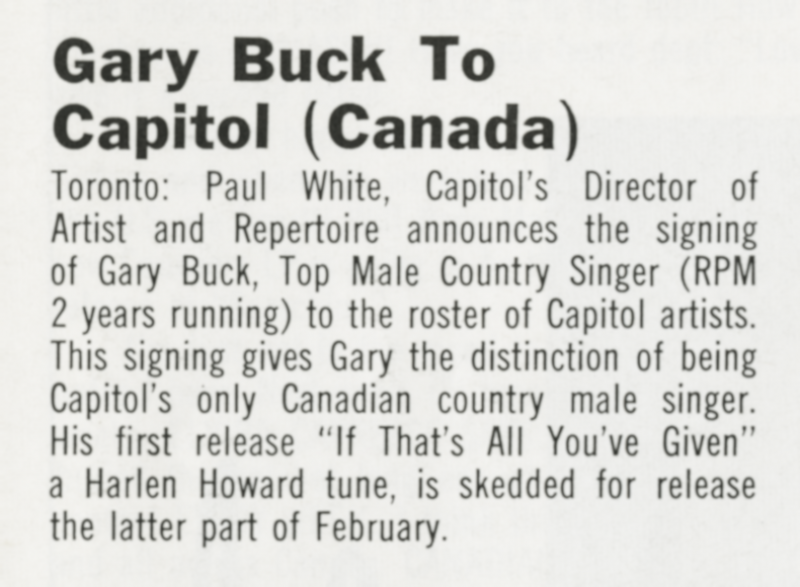 By the mid-1960s Buck had relocated to Kitchener, Ontario, where he became a household name on The Gary Buck Show on CKCO-TV. The series ran from 1967 to 1969 and further established him as one of the few Canadian artists with both chart credibility and television visibility. He appeared frequently on Canadian and American country television specials, and had the distinction of performing several times at the Grand Ole Opry in Nashville during the late 1960s and early 1970s. Even as he remained an active recording artist deep into the 1990s — releasing albums such as Western Swing and Country in 1998 and the gospel project Don’t Be Standin’ on the Outside in 2002 — Buck was increasingly influencing the industry from behind the console and behind the desk.