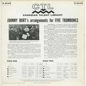 In 1962, Burt was appointed music director of the Canadian Talent Library (CTL), a role he held for a decade. He supervised recordings for dozens of Canadian artists and made numerous LPs of his own. These included his debut Trombone (CTL 5004), Reminiscing (CTL 5014), and Song of the Tropics (CTL 5055), all showcasing his signature blend of lush string writing, jazz-inspired rhythm sections, and tasteful piano work. Trombonist Teddy Roderman was featured prominently on several of these records, including Trombone and Reminiscing, with Burt contributing original compositions like “Theme for Susan” and “Mike Fright.”