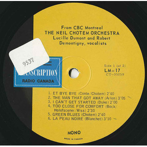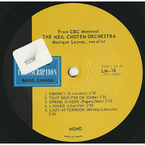 As conductor, Neil Chotem made several recordings with the CBC Montreal orchestra: national anthems (1950, RCI 46), pop song arrangements (1951, RCI 31 and 32), selections from Dolores Claman's musical comedy Timber!! (RCI 119), as well as arrangements of songs from the Maritimes (RCI 152), Canadian regimental marches (RCI 158), and pop songs (RCI 176, 177, 178, 259, and 346, the last exclusively of music by Gordon Lightfoot). As arranger, conductor, and pianist he took part 1955-60 in the CBC broadcasts 'Music from Montreal,' often performing Canadian works (by Robert Farnon, Robert Fleming, Michel Perrault, Eldon Rathburn, etc). He was also conductor for the recording of Marc Huard's Thèmes et mélodies (1974, Céleste MA-2224). Chotem appeared as a guest conductor of the Montreal Symphony Orchestra in the summers 1969-72, of the Quebec Symphony Orchestra 1970-2, and of the National Arts Centre Orchestra.