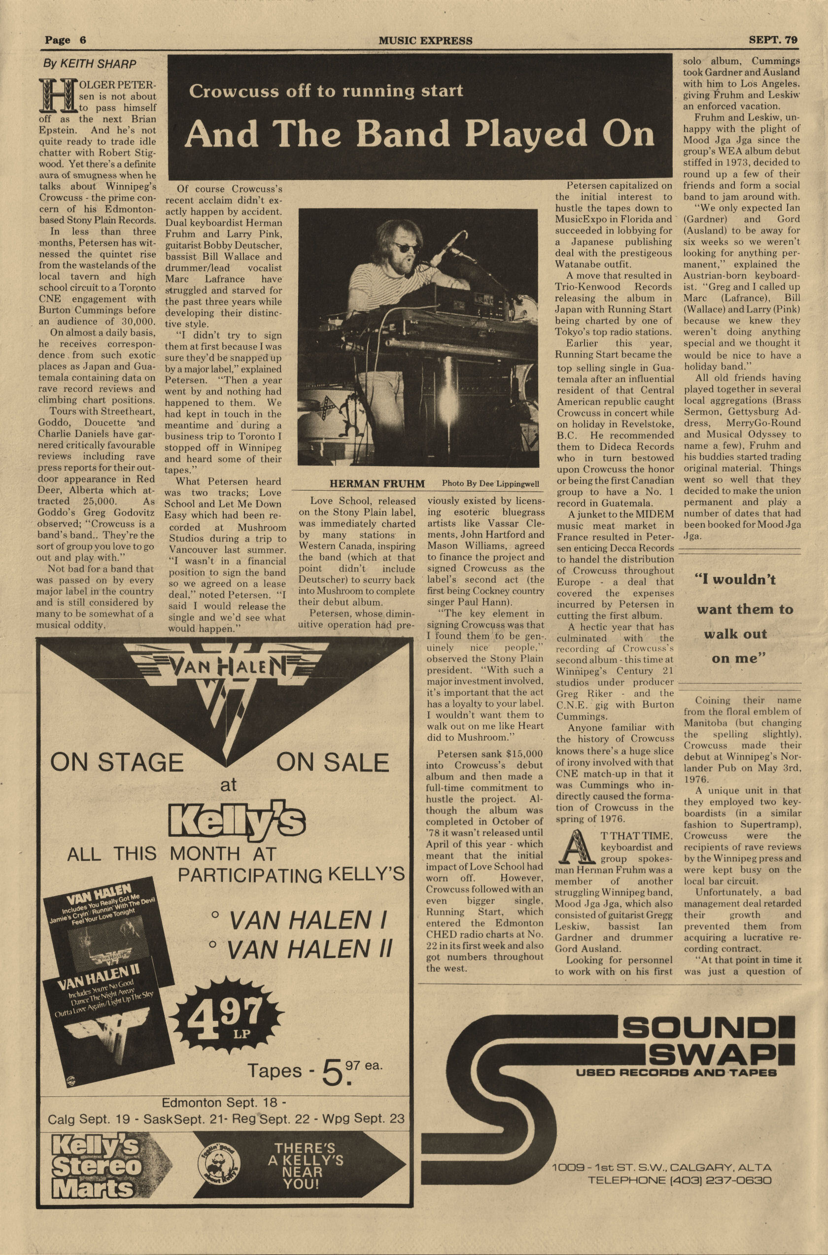 Stony Plain Records' label boss Holger Petersen financed recording a full-length album at Mushroom Studios in Vancouver. At the time of recording their 1979 debut, the band lineup was Bill Wallace, Larry Pink, Marc La France, and Hermann Fruhm. The appropriately titled lead-off "Running Start" was released as a 7" single and would turn out to be their biggest hit, earning a number one in Guatemala. Crowcuss toured extensively, opening for Burton Cummings, Prism, Goddo, Doucette, and Streetheart, but couldn’t crack the radio charts. Crowcuss recorded and released the follow-up Starting To Show in 1980 in Winnipeg, this time including guitar player Bob Deutscher. With little traction off the second album, the group soon disbanded and went on to other projects.