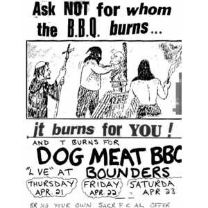 Dog Meat BBQ made their first public appearance in June 1986 at the Peace-a-Chord, an annual alternative music festival held in Bannerman Park, St. John's. As Justin was unavailable for this gig, drumming duties were performed by Danny Thomas, who would later go on to play in The Thomas Trio and the Red Albino.