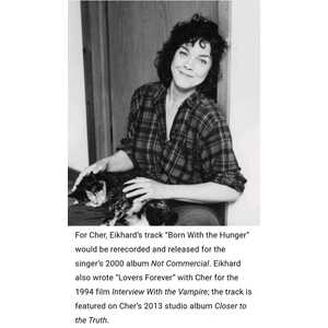 After a discussion about songwriting with Hal David, Eikhard concentrated on composing. She has come to be best known as a songwriter, and has written or co-written songs recorded by the US singers Kim Carnes, Cher, Rita Coolidge, Emmylou Harris, the Pointer Sisters, and Bonnie Raitt. In 1991 Raitt's hugely successful release of Eikhard's "(Let's Give Them) Something to Talk About" (Luck of the Draw) won a Grammy award and skyrocketed Eikhard onto a higher plane of financial freedom and professional respect. Raitt described her experience with recording the track as "like hitting one out of the park, my first number one..." Eikhard has also written songs with the Laurie Bower Singers, Gary Buck, George Fox, Catherine McKinnon, Alannah Myles, Peter Pringle, Ginette Reno, Donna Ramsey, and Sylvia Tyson and Quartette, among others. She has also sung on hundreds of recording sessions with numerous artists.