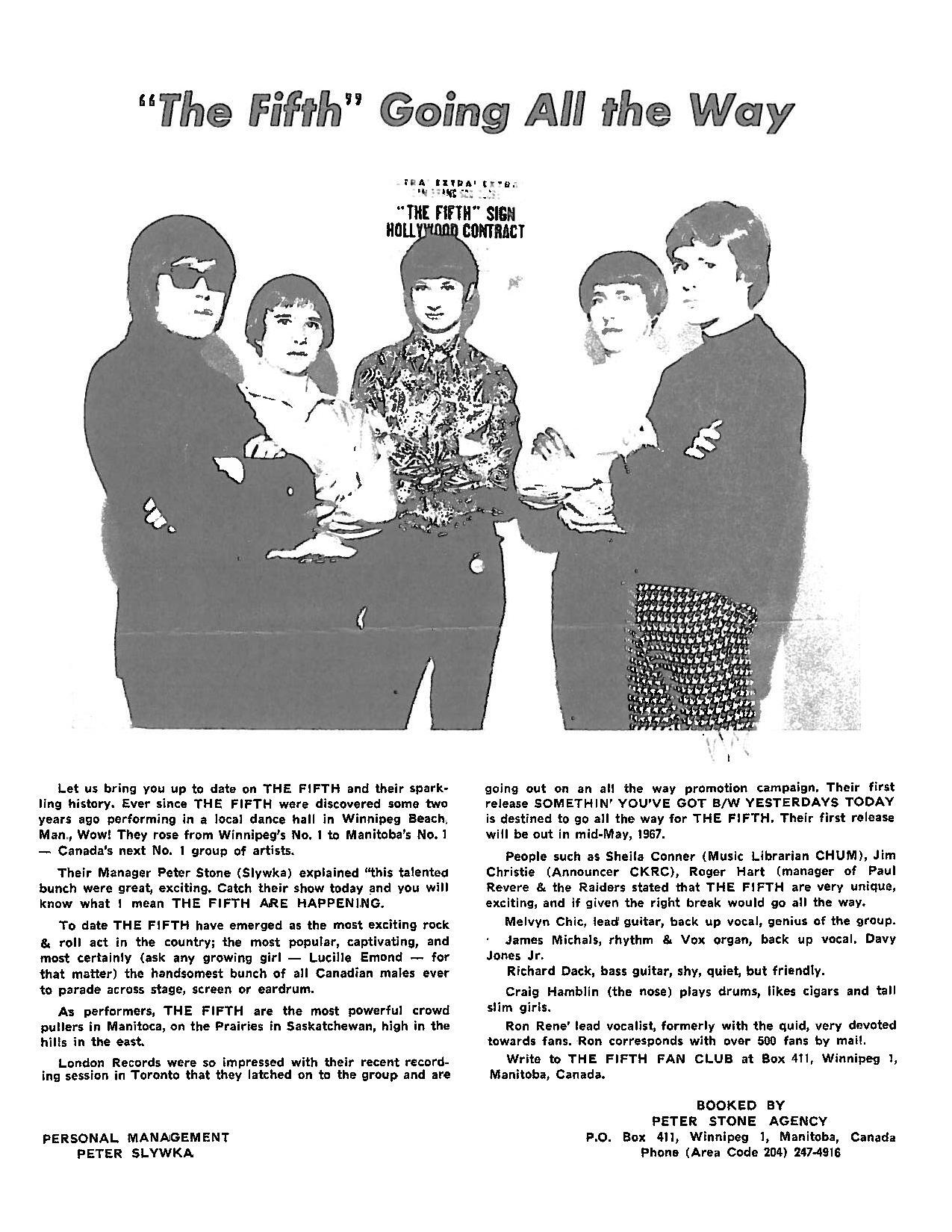 1968 saw the release of two more singles - Sunshine People (b/w Don't Worry About Me Babe) and All I Want is Love (b/w Caprice). By the close of 1968, The Fifth had become one of the most popular and dynamic groups on the Winnipeg music scene, and named one of the top three bands in the city.