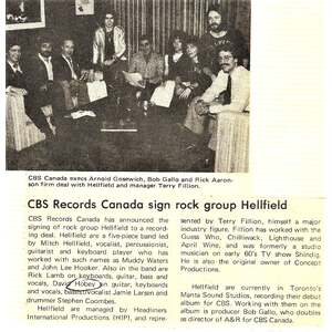 With Gallo and CBS Canada president Arnold Gosewich acting as producers, Hellfield released their self-titled debut on Epic in '78. A combination of hard rock and power-pop, the album contained two singles, "Too Late", followed by "Tell Me Are You Listening". Both tracks gained significant FM airplay here in Canada and the album sold well in the US as an import, also due in part to such tracks as "Magic Mistress" and "Fancy Nancy". But despite the band's initial success, Gallo felt some changes were needed. Unhappy with the work of Coombs, he recommended a new drummer. In fact, it was Field himself who sat behind the kit for much of the first record. Enter new drummer Billy Smith.