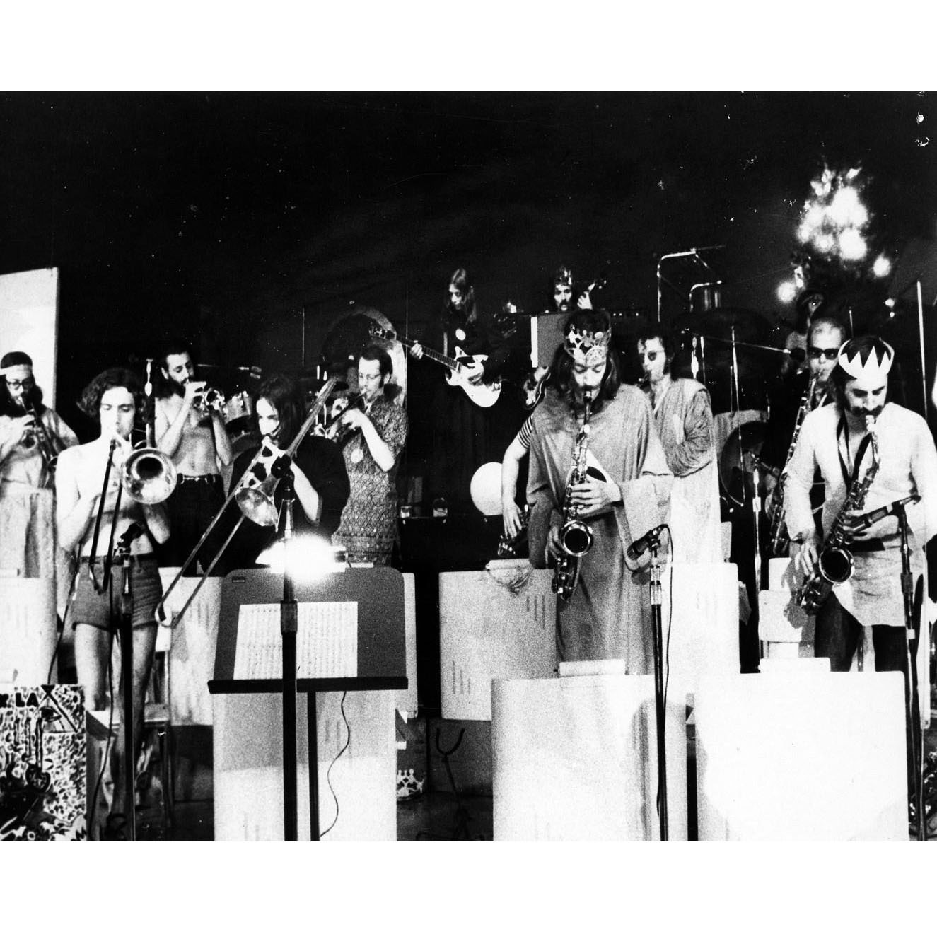 Si les performances du groupe varient, le nombre et l'identité des musiciens font aussi preuve d'une grande mobilité, contribuant à l'imprévisibilité de chaque apparition. Ils se retrouvent ainsi une quinzaine à participer à l'enregistrement du premier album du groupe, au tout nouveau studio André Perry, en 1969. Un 45 tours est même lancé à partir de cette session: "Viens danser le O.K. là" et "L'affaire / J'ai perdu 15 cents dans le nez froid d'un ange bronzé" qui fait aujourd'hui figure de pièce de collection. Le reste de l'album juxtapose l'adaptation libre d'un air de bossa nova "Desafinado", un "Agnus Dei" de Bach ou une reprise instrumentale d'un air des Beatles "She's Leaving Home" parsemés de thèmes électroniques créés par les sorciers du Moog que sont alors André Perry et Buddy Fasano. Bien que l'Infonie soit active depuis 1967, elle se fait surtout remarquer à partir de son apparition à la Nuit de la poésie tenue en mars 1970 et dont témoigne le légendaire film de Jean-Claude Labrecque. Le public y découvre cette curieuse confrérie aux allures médiévales à travers les élucubrations d'un Raôul Luôar Yaugud Duguay, officiant dans une tenue qui évoque à la fois l'habit du grand-prêtre et le pelage de l'homme des cavernes.