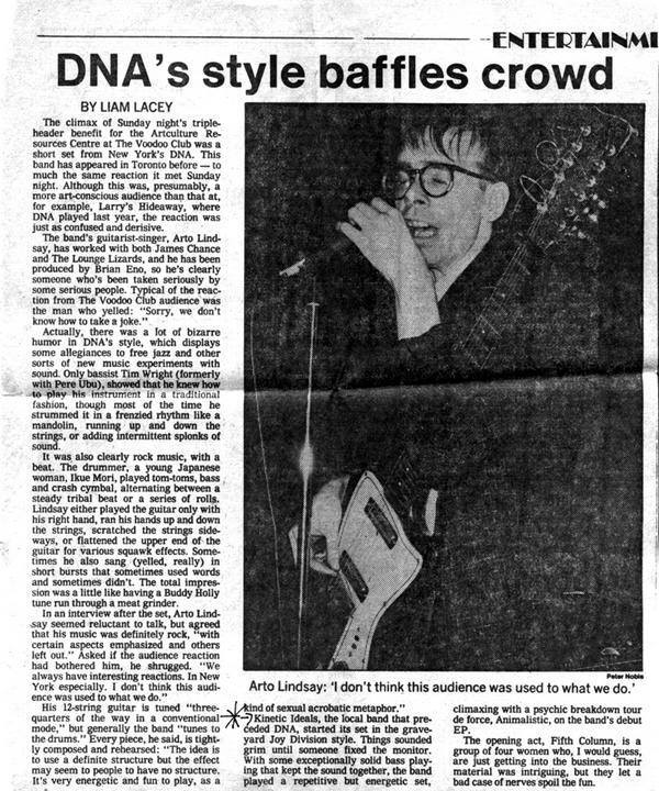 As the band moved into the club circuit, their reputation grew quickly. Live audiences reacted to the group’s physicality as much as their music; Rullman often treated the stage like a provocation, twisting himself in oversized sweatshirts, throwing his body into the rhythm, and pushing performances toward a kind of physical breaking point. Reviews from the period consistently describe the group as the most arresting presence on multi-band bills. In one notable case, covering a Music Hall show, a local critic observed that Kinetic Ideals “out-performed” the visiting U.K. band The Teardrop Explodes—a rare moment in which a Canadian opening act eclipsed an international headliner during Toronto’s early “British invasion” marketing push.