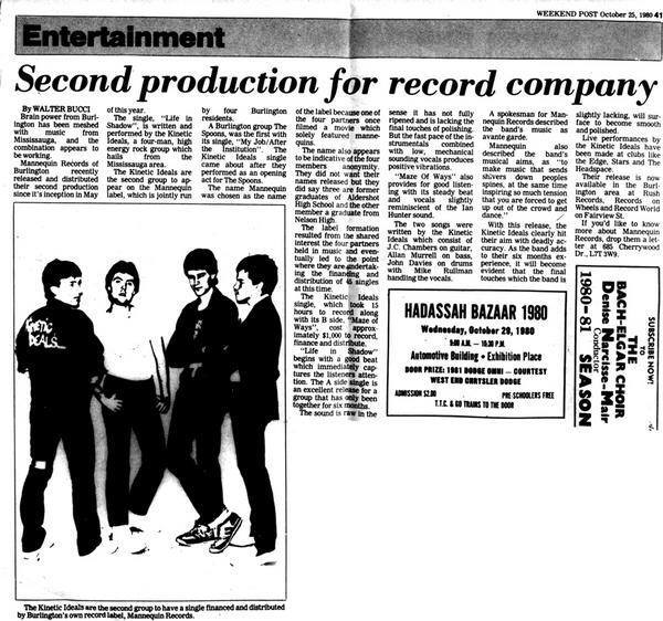 Their first major step came when Burlington’s newly formed Mannequin Records invited them to record a single. The label, established by members of The Spoons, was still taking shape, and Life in Shadow b/w Maze of Ways became only its second release. A Weekend Post feature in 1980 noted how the band had impressed Mannequin’s partners after being spotted at a local fair, the label praising the group’s raw energy and willingness to record material on their own terms. The single captured the group in their earliest form—lean, sharp, and unfiltered—and helped establish them as a serious new voice in a scene then dominated by larger Toronto acts.