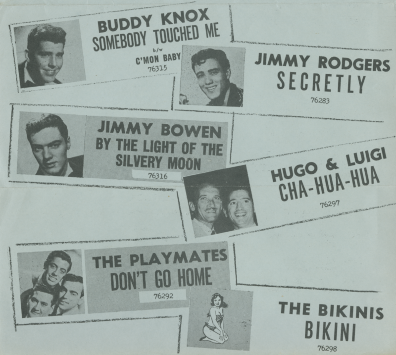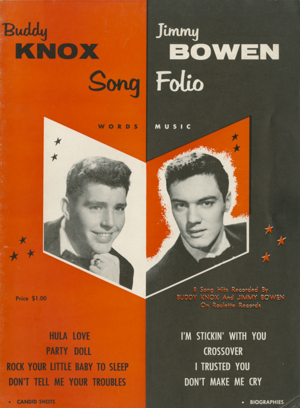 The first release was "Party Doll", and then at almost the same time Roulette released "I’m Sticking With You". With "Party Doll" going number one and selling well over a million singles and "I’m Sticking With You" being a top 40 hit and single sales over one million, the band was on top of the world. That same year Buddy Knox and the Rhythm Orchids released "Rock Your Little Baby To Sleep", a top 20 hit, and "Hula Love", a top 10 hit. Both singles sold over one million copies.