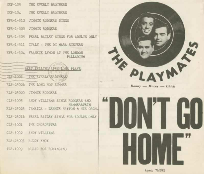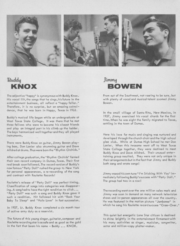 The Rhythm Orchids big break came from Don Lanier’s sister who worked in New York City as a model. She heard that Roulette Records, a new record label in town operated by Morris Levy, was looking for some new talent. Back in the 50’s getting your music heard was a little bit easier that it is today, so she called Morris Levy and dropped a copy of "Party Doll" off for him to hear. Morris liked what he heard and made arrangements for the band to come to New York. So the Rhythm Orchids, Buddy Knox, Jimmy Bowen, Don Lanier and new member David Alldred, went to meet Morris Levy at Roulette Records in New York City.
