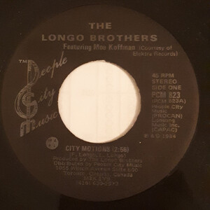 "City Motions" (Featuring Moe Koffman) bw "If The Feeling’s Not Right" was released on People City Music PCM-823 in 1984. The A side was jointly written by Frank and Larry. The production was a joint effort between the Longo Brothers, Jim Mancel and John Marmora. It got into the CanCon Top 10 Adult Contemporary chart that year. It charted from October 6 to the 27th.
