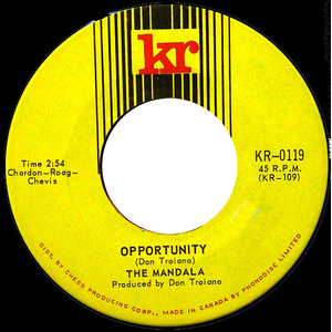 Thanks to their dynamic stage act, Mandala had won a recording deal with the KR label in the US and, on their return to Canada, recorded their debut single, Troiano’s “Opportunity” c/w Olliver’s “Lost Love” at Chess studios in Chicago with The Dells providing backing vocals. Released back home at the tail end of January 1967, the group’s debut single stormed into the Toronto top 10, peaking at #3 on the CHUM chart on 20 February.