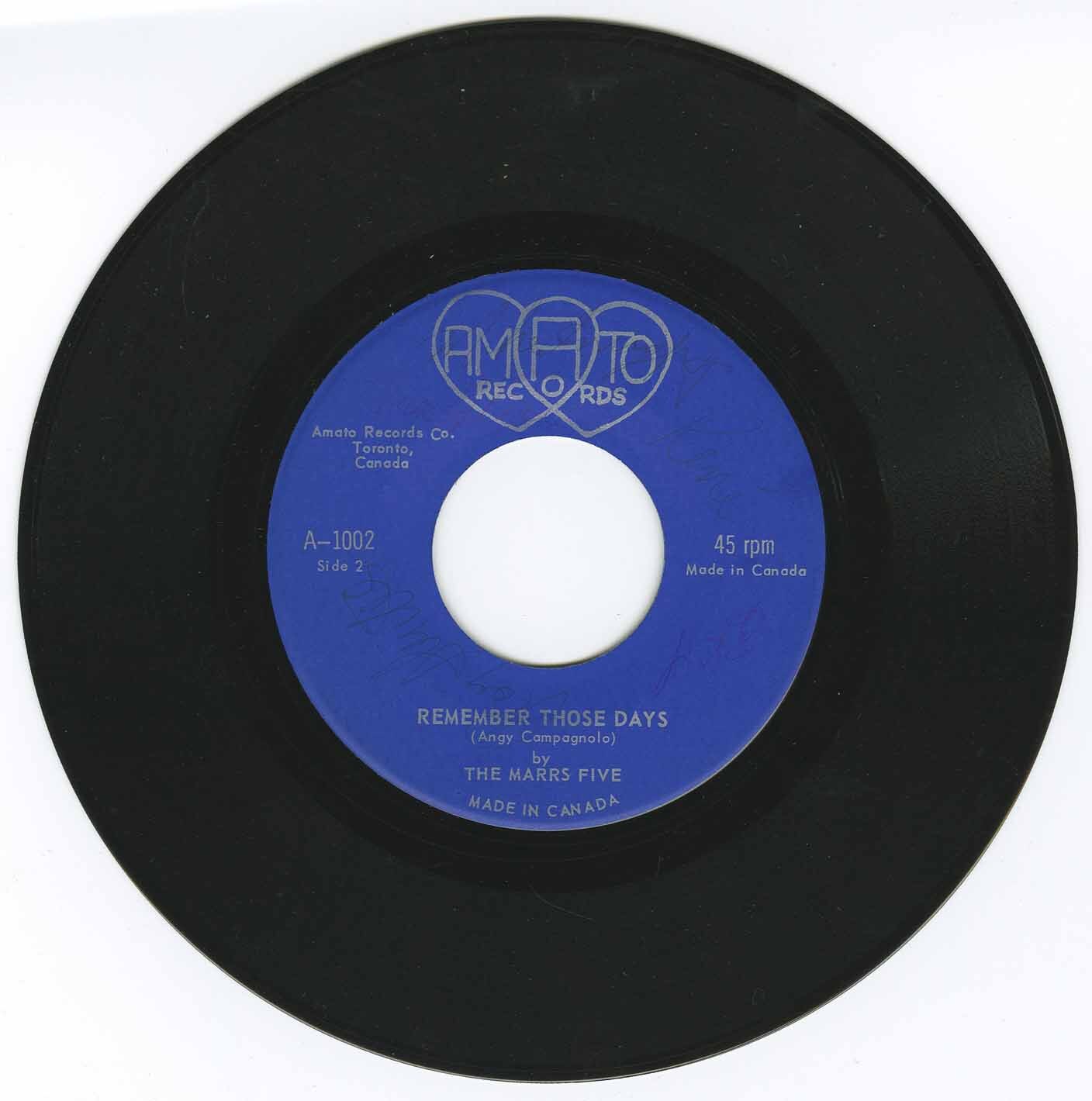 Amato Records was a small independent label in Toronto, known primarily for private-press releases by Benny Spada & The Flames in 1962. Marrs Five sit as an unusual youth-beat entry in that short catalog, illustrating the ad-hoc, community-driven nature of many early Canadian independent labels — someone with access to a pressing plant helping a local group get a single out into the world.