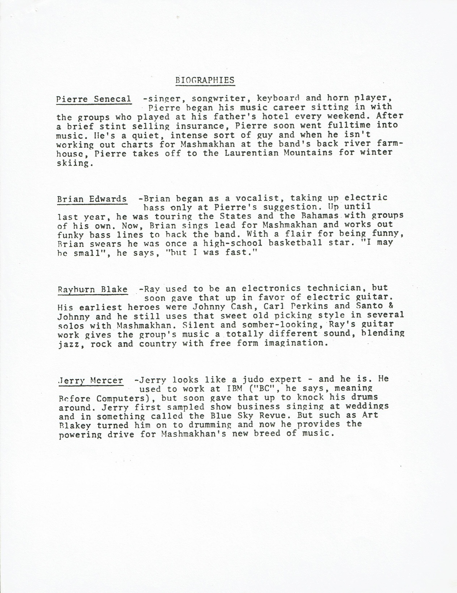 Mashmakhan. Montreal rock band. It evolved from a succession of groups in the 1960s - eg, the Phantoms, the Dominoes, and Triangle, the last backing R&B singer Trevor Payne - that included the songwriter Pierre Sénécal (vocals, keyboards, flute), Rayburn Blake (guitar), and Jerry Mercer (drums). On leaving Payne, the trio made their debut in February 1969 at a Montreal club, the Laugh In, and soon after gave the first rock concert heard at the NAC. The bass guitarist Brian Edwards was added, and the name of an exotic hallucinogen adopted, prior to the release in 1970 of the band's first LP, Mashmakhan (Col ELS 365).