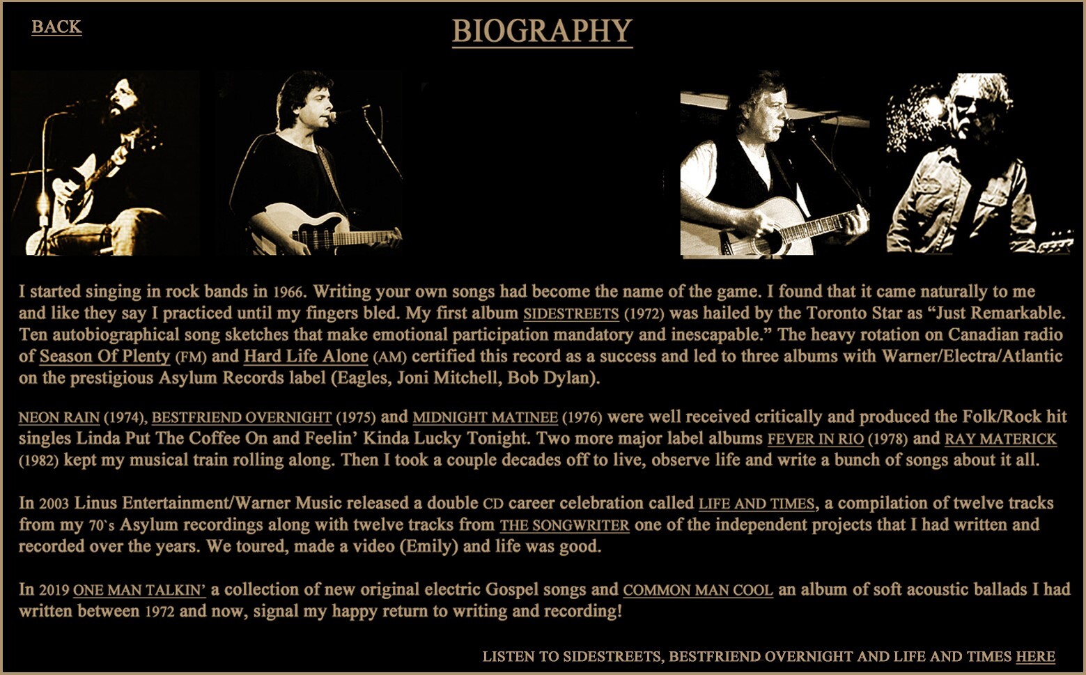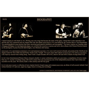 “Just one more,” promised the photographer. Ironically, the walls behind them sported a colourful collage of assorted rock star faces. All the most successful performers, the Lightfoots, the McLauchlans and the Dylans were up there, staring out from the wallpaper like olives in a salad.