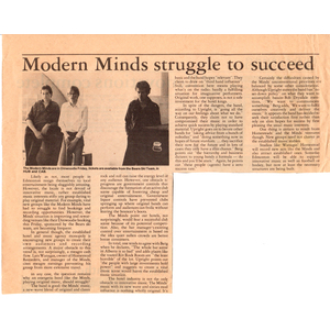 They quickly became one of Edmonton’s most recognizable underground acts during a time when the city’s live music scene was dominated by cover bands and risk-averse promoters. Modern Minds were committed to originality, practicing relentlessly and building their identity both conceptually and musically. In their early press bio, they declared that rock and roll was not a nostalgic product or background noise, but “teenage glory”—a vital expression of frustration, joy, and identity. “To someone who truly believes, there is no divisible line between one’s music and one’s very life.”