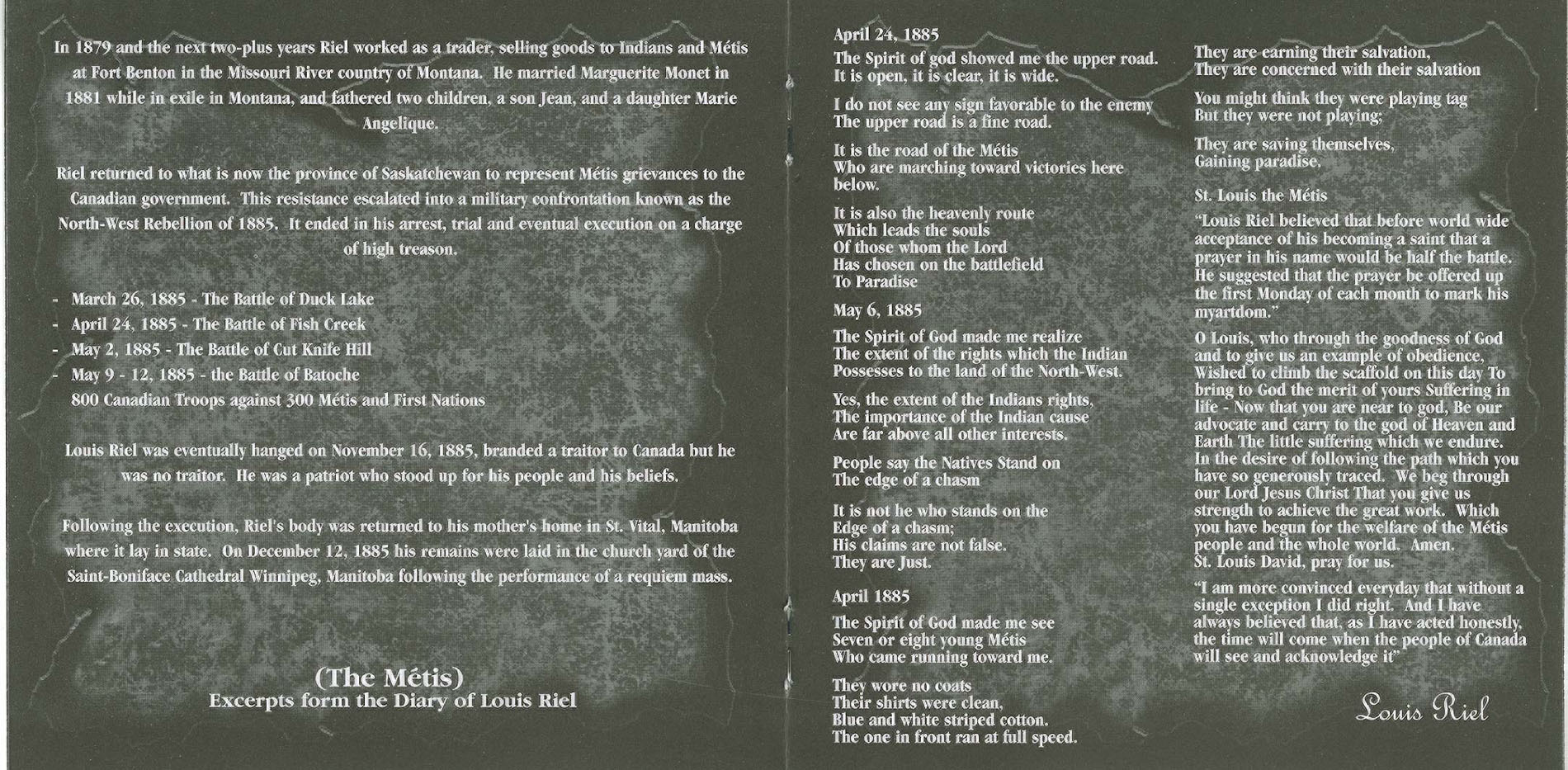 Willie Dunn - Louis Riel, ST, Kot'ai KOT 3000, 1978 "Louis Riel was the leading figure in the fight for independance of the Metis, or half breed nation, in the Canadian West, between the years 1860 to 1885. Riel, a very religious person of the Christian faith, and himself a half breed, was a man who believed in the self determination of the half breed nation. He was executed in Regina in 1885, and with the hanging died the hopes of tens of thousands of his people.