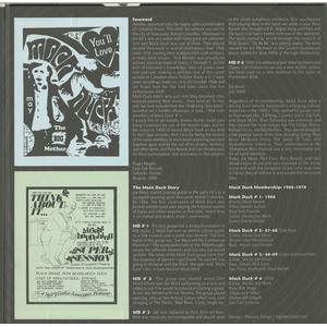 The combination of folk and rock at that time eventually led to a group called Joe Mock and No Commercial Potential with Stephen Barrett, Spence Sutton and Tom Hazlitt. which evolved into the Mock Duck (trio, Glen Hendrickson and Lee Stephens) (quartet, Glen Hendrickson, Ross Barrett, Rick Enns) which recorded and played what is now called Acid Jazz and other things and on other things that are not normally described as musical instruments. They played the same venues as the Doors, The Jefferson Airplane, Country Joe and the Fish. Places such as the Retinal Circus, The Afterthought (see poster), The Garden Auditorium, Big Mother, the Eagle Auditorium in Seattle. They were opening act for the Steve Miller Band, Quicksilver Messenger Service, Lee Michaels, Corky Seagal Blues Band. Following the decline of the psychedelic era a solo album was recorded but never released. (soon to be available here on line). The Canadian West Coast music scene was then experiencing a surge of new energy from conscientious objectors leaving the United States. Rick Scott, Shari Ulrich, Doc Fingers, Alta Grey, Bruce Miller, Tom and Jack Lavin, Rick Brockner and Jack Smith were all having an effect on the local musical community. Joe Mock and Friends on one week, would be Bruce Miller and Friends the next, and Jack Smith and Friends the next.