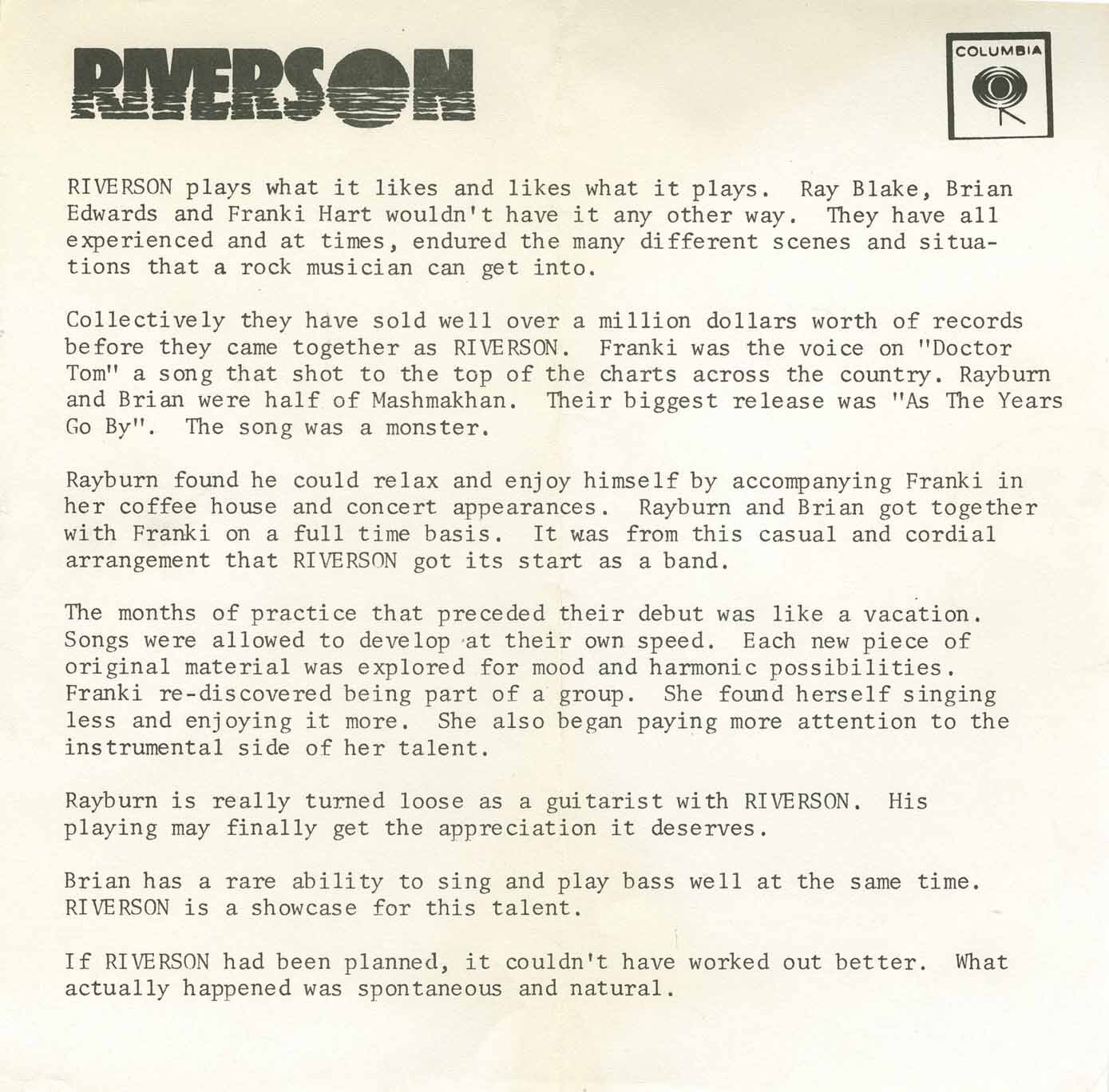 Hart’s next major project, Riverson, brought her together with Rayburn Blake and Brian Edwards—two core members of Mashmakhan. With drummer Graham Lear and later Michael Berman, the band recorded a polished, introspective album at Manta Sound in Toronto, released by Columbia Records in 1973. Blending folk lyricism with West Coast psych and chamber pop textures, Riverson’s self-titled LP is now considered a Canadian cult classic. Hart’s vocal performances on “Can’t Live Without You” and “Eleanor Rigby” stand among her finest recorded work.